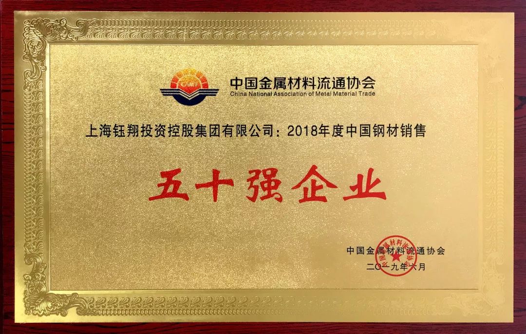 會上頒發了一系列鋼鐵行業內的年度大獎,鈺翔控股集團憑借在鋼鐵智慧供應鏈領域取得的成果、實力和口碑榮獲中國金屬材料流通協會2018年度中國鋼材銷售50強、2018年度中國鋼鐵供應鏈建設示范企業兩項殊榮。